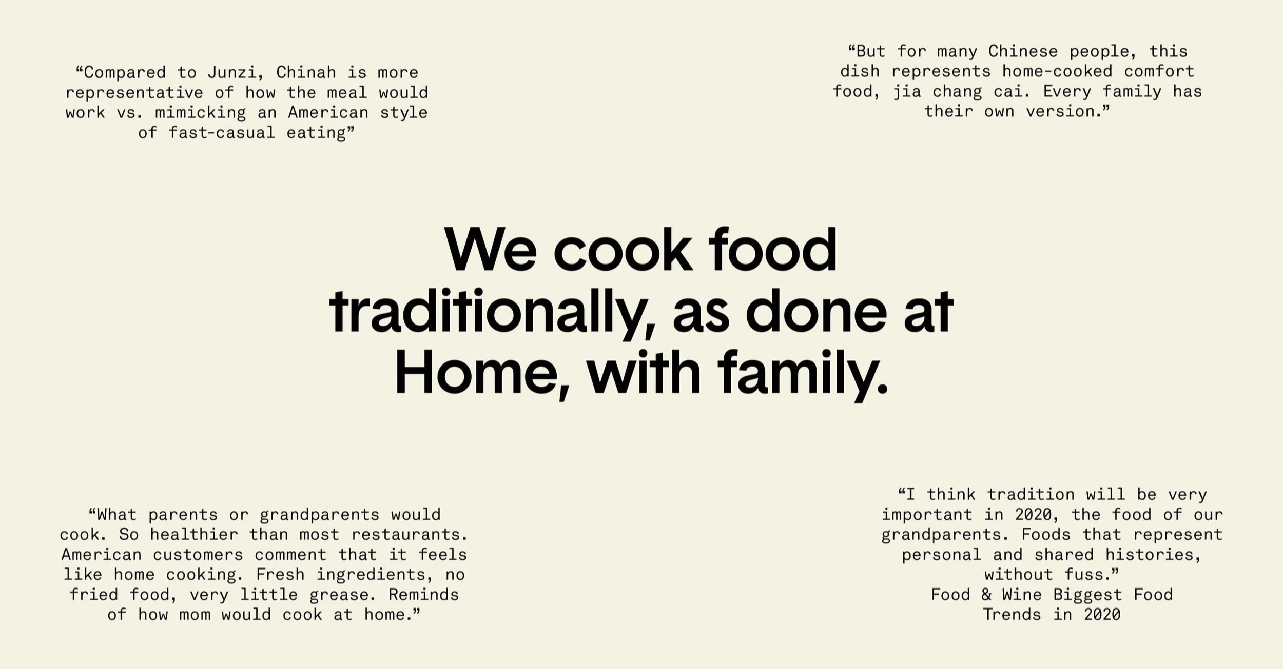 Chinah is an opportunity to own a new category of Chinese food in the US, by introducing a broad American audience to a different kind of Chinese cooking. Chinah serves homestyle meals that customers can enjoy on a daily basis. The food is prepared with fresh ingredients in a simple, thoughtful way that just tastes good.